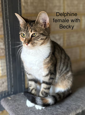 Delphine isn't spooked easily or a scardy cat, but she is quiet. You will find she sits away from the group, observing everything going on. She doesn't socialise a lot either with the other cats or with humans. But she doesn't mind a pat or being picked up for a cuddle. She seems to be comfortable within herself. She loves to play with toys with feathers and enjoys sleeping on the bed with you.