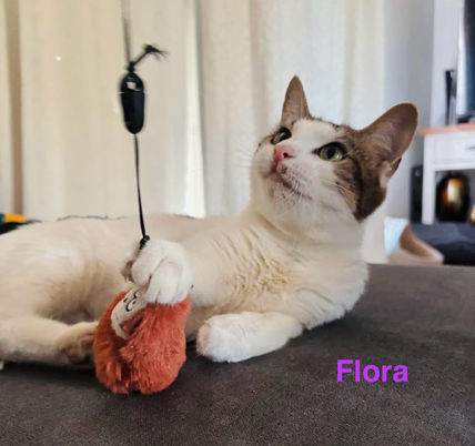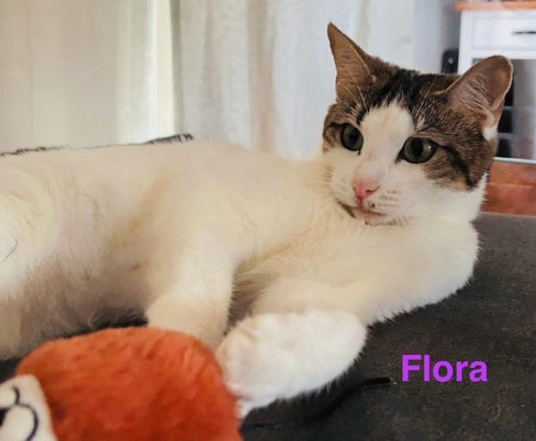 The thing about flora is she’s not needy at all! She’s happy to sit and wait for you to come to her. She loves laying around in a cool or dark spot. She’s such a stunning cat with an unknown past but a little nervous at times, especially when getting to know you.